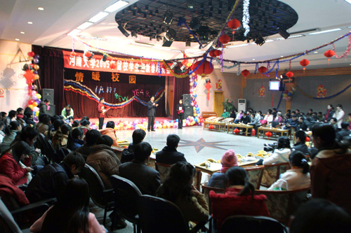 上午10时,我校教职工活动中心喜气洋洋、暖意融融,由共青团河南省委和我校师生共同举办的“河南大学2005年留校学生迎新春联欢会”在这里拉开帷幕。