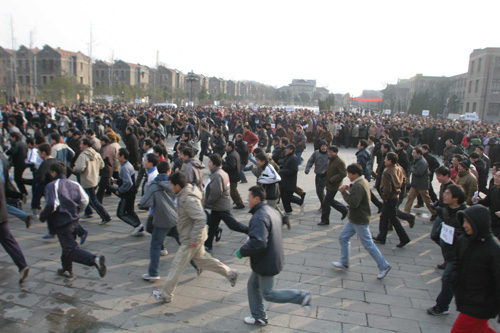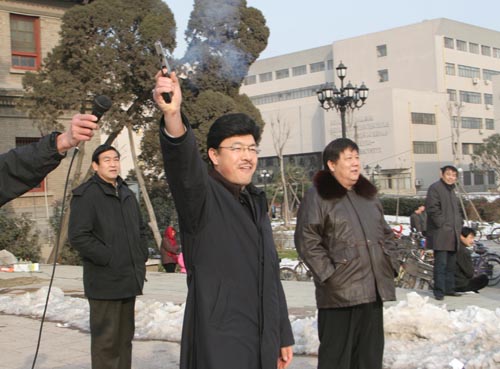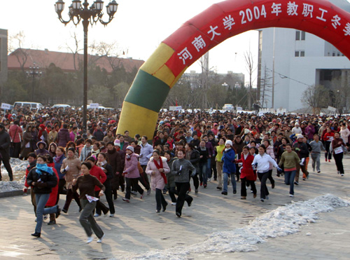 2004年12月30日下午,冰天雪地、寒风刺骨,河南大学礼堂前广场上,“河南大学2004年教职工冬季越野赛”的红色拱形门下,三千多名教职工热情高涨,如箭在弦。2时40分,校党委副书记郑邦山举枪发令,第一组千余名教职工冲向跑道。