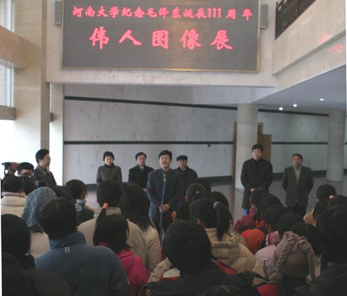校党委副书记郑邦山到场并发表讲话,他说,毛泽东作为一名伟大的领袖,他领导全国人民在革命战争和新中国建设中取得了卓越成就。在毛泽东诞辰111周年纪念日到来之际,举办这样一次展出,对缅怀先辈们的丰功伟绩,继承革命先烈的遗志,具有十分重要的意义。他希望通过这次展出,使更多的学生领略到伟人毛泽东的风采,从中汲取精神力量,并将其转化为学习的动力,做一个对社会有用的栋梁之才。