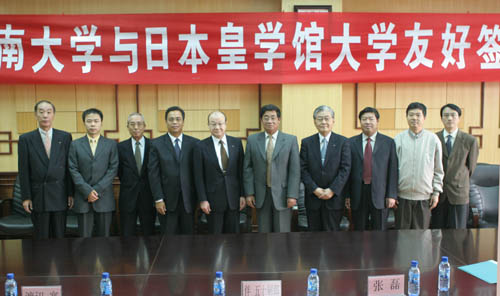 19日上午9时,王发曾副校长代表关爱和校长对客人的到来表示了热烈的欢迎,向客人介绍了学校的发展历史及现状,并对伊势市日中友好协会在建立起我校与皇学馆大学间友好关系方面所做的工作给予了高度的评价,对两校间的合作寄托了殷切的期望。在卢克平副校长的主持下,双方签署了《中国河南大学与日本皇学馆大学学术交流协议》,两校将于2005年9月开始正式启动双方间师生交换项目,该项目启动初期,交换名额暂定为每年2名,以后根据交流情况可增至4名,参加该项目的人员可享受接收方免除学费、研究费及住宿费的待遇。