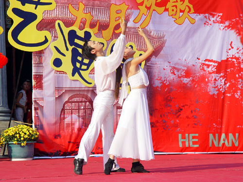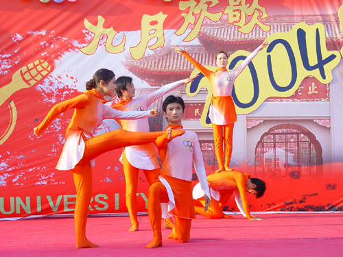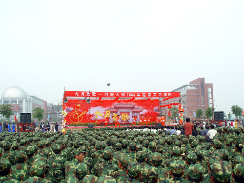 9月23日下午4时和24日上午9时,由校团委主办的“九月欢歌”河南大学2004年迎新文艺演出在校大礼堂前和金明校区先后拉开了帷幕。出席本次演出的有71320部队、开封市军分区、顺河区人武部的有关领导,我校党委书记张秉义,副校长、新生军训领导组组长赵国祥,副校长史全生及新生军训团领导组成员。我校2004级的全体同学观看了演出。