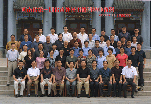 2004年7月11日,河南省委组织部干部培训中心河南大学分部第一期省直处长进修班结业典礼在我校新行政楼第四会议室隆重举行。出席结业典礼的有我校党委副书记赵豫林,副校长赵国祥,党委常委、组织部部长史战芳以及首期进修班的全体学员。结业典礼由赵国祥副校长主持。