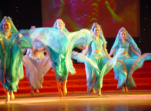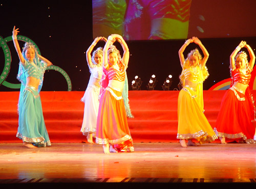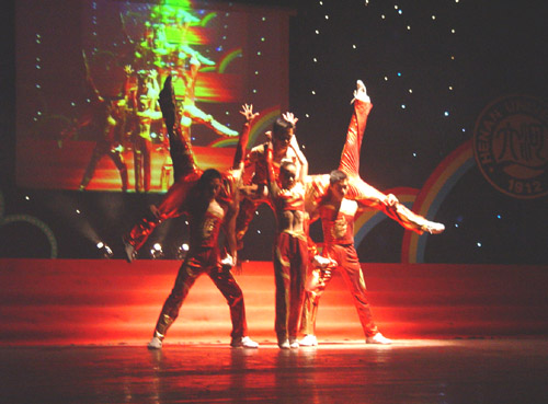 晚上的演出让大礼堂成了欢乐的海洋,形式多样的节目让观众感到目不暇接。《共青团之歌》激励着我们继往开来,具有异国风情的《尼泊尔舞》中演员们婀娜的身姿、匀称的台面组合给人以美的享受。我校体育学院健美操队在这次比赛中更是力拔头筹,以9.88分,取得了全省第一名的好成绩,并获得最佳难度奖。今天晚上他们矫健的表演再次征服了所有观众。