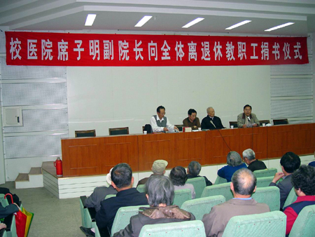 2004年5月11日下午,我校离退休工作处在科技馆一楼报告厅举行“校医院席子明副院长向全体离退休教职工捐书仪式”,150多位离退休老同志冒雨参加了捐书仪式。