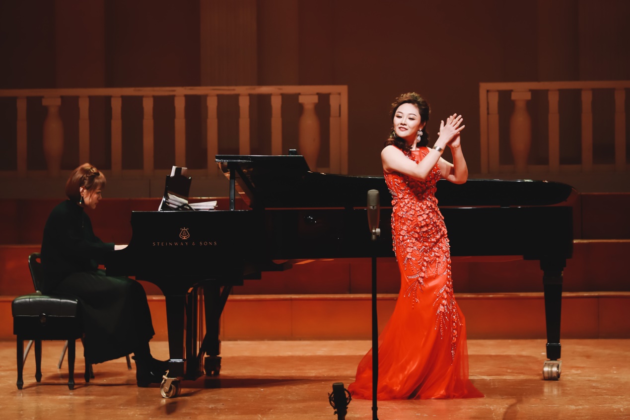 对于中国作品的诠释,音乐会选择了中国近现代艺术歌曲《玫瑰三愿》,中国古诗词艺术歌曲《忆江南》、《越人歌》,和中国当代新艺术歌曲《牡丹亭》三种题材的中国艺术歌曲,并将这三种不同类型的艺术歌曲风格演唱做出精准的把控,成功的完成了从古典到现代的穿越。她还与学生一起,共同演绎了一首由新疆民歌改编而成的花腔女高音声乐作品《玛依拉变奏曲》,惊艳的美妙歌声为中国作品板块绚丽收尾。