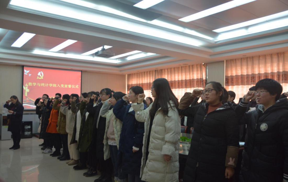 1月11日下午,数学与统计学院党委在学院党员活动室举行新党员入党宣誓仪式。院党委书记史富强,党委副书记、院长冯淑霞,副院长杨一平,学院2018年下半年发展的预备党员以及老党员、入党积极分子代表出席。院党委副书记赵红磊主持宣誓仪式。
