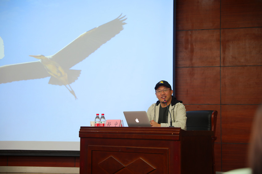 孙宁通过分享两个有趣的生命故事开启讲座。他介绍了他执导的作品《大天鹅》的故事,通过该部影片的推介片,在场师生了解了黄河中游三门峡栖息地上大天鹅的生活场景。孙宁讲述了团队在拍摄过程中遭遇的天气、体力、精神等方面的各种考验。他表示,三年的拍摄过程是艰辛的,虽然犹豫过、迷茫过,但我们都能够不忘自己的初心,坚持下来。