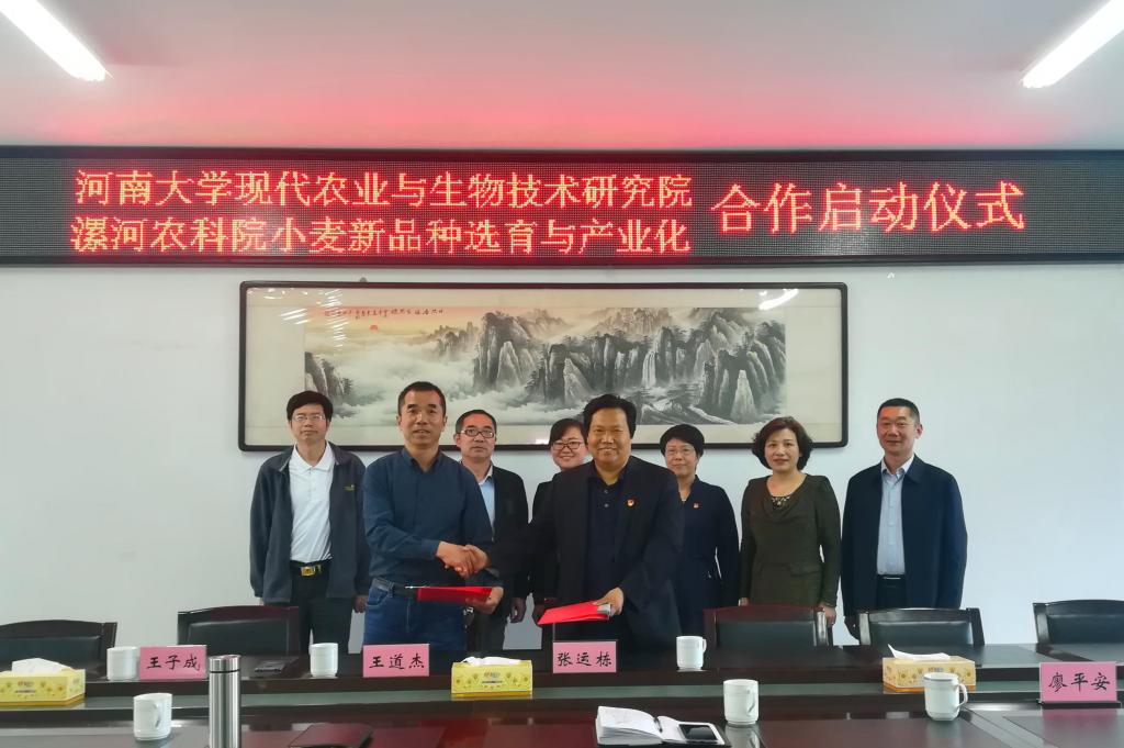 漯河市农业科学院始建于1955年,是河南省研究小麦、玉米、花生等作物新品种的骨干科研单位。近年来,我院与漯河市农业科学院开展了不同形式的合作。挂靠在我院的河南大学现代农业与生物技术研究院成立以来,与漯河市农业科学院建立了更加紧密的合作关系。漯河基地是现代农业与生物技术研究院与漯河市农业科学院小麦研究所合作建立的小麦育种基地,现已合作育成“漯麦163”、“漯麦906”两个小麦品种,另有多个合作育成的优良小麦新组合正在参加河南省及国家黄淮区小麦联合试验。