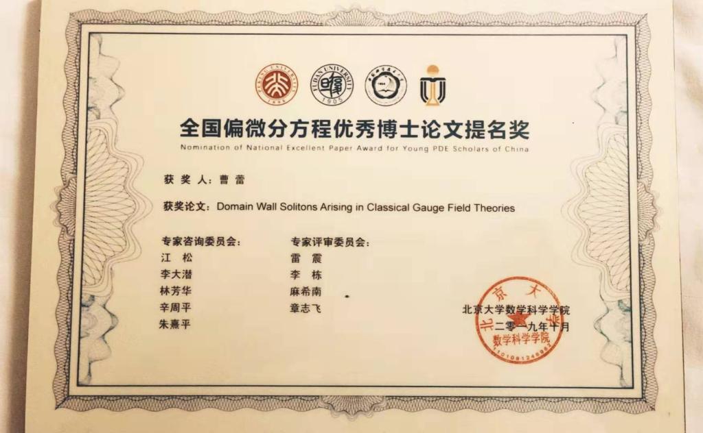 10月11日至10月13日,第二届全国偏微分方程博士生论坛于北京大学举行。我校数学与统计学院2017级博士生曹蕾(导师为杨亦松教授)受邀参加论坛,获得全国偏微分方程优秀博士论文提名奖。