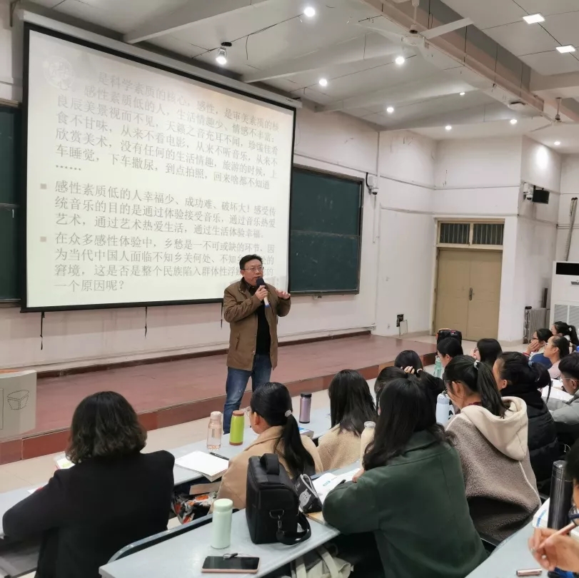 由音乐学院校特聘教授、博士生导师陈文革老师主讲的传统音乐与人文素养,为大家讲解了丰富多彩的中国传统民歌,使同学们对中国民间传统音乐有了进一步的认识和了解,提高了同学们的艺术修养,也激发了对传统民间音乐的兴趣。