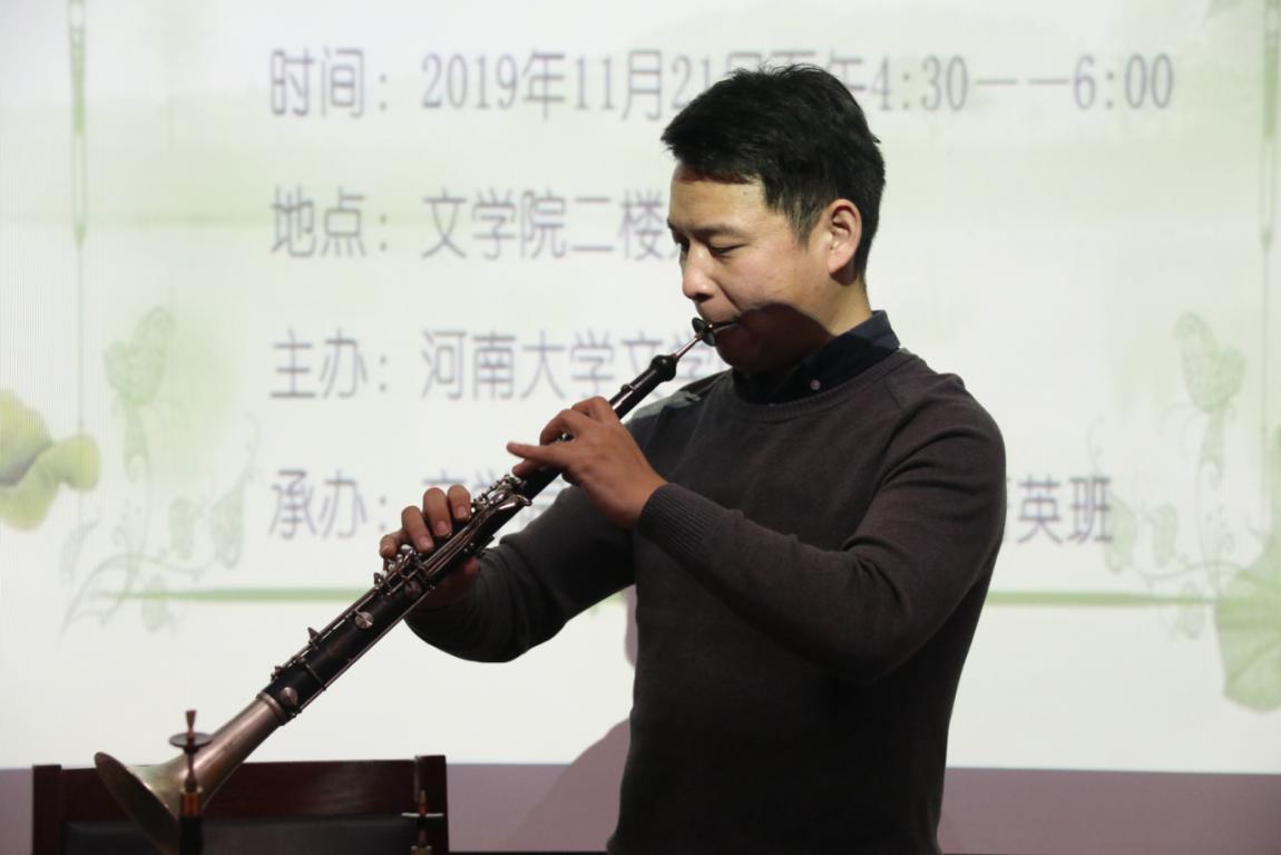 “唢呐艺术欣赏”由音乐学院唢呐教师刘可可老师主讲。他为大家介绍了唢呐的发展历程,讲述了唢呐名字的由来,并现场为大家演奏了唢呐名曲,其中《怀乡曲》片段使在座的学生感触颇深,《百鸟朝凤》中的精湛技艺让全场叹为观止,也赢得了在座同学的热烈掌声。