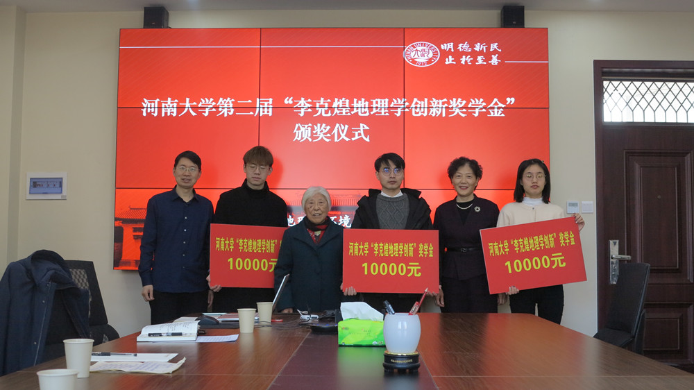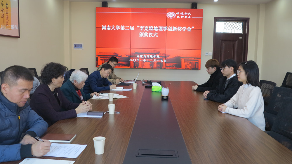12月17日上午,河南大学第二届“李克煌地理学创新奖学金”颁奖仪式在地理与环境学院301会议室举行。李克煌夫人赵家珍女士、河南大学校友工作与教育发展基金会办公室主任刘波、地理与环境学院执行院长乔家君、党委副书记徐小军、2021级研究生辅导员周生辉及获奖学生参加了颁奖仪式,仪式由徐小军主持。
