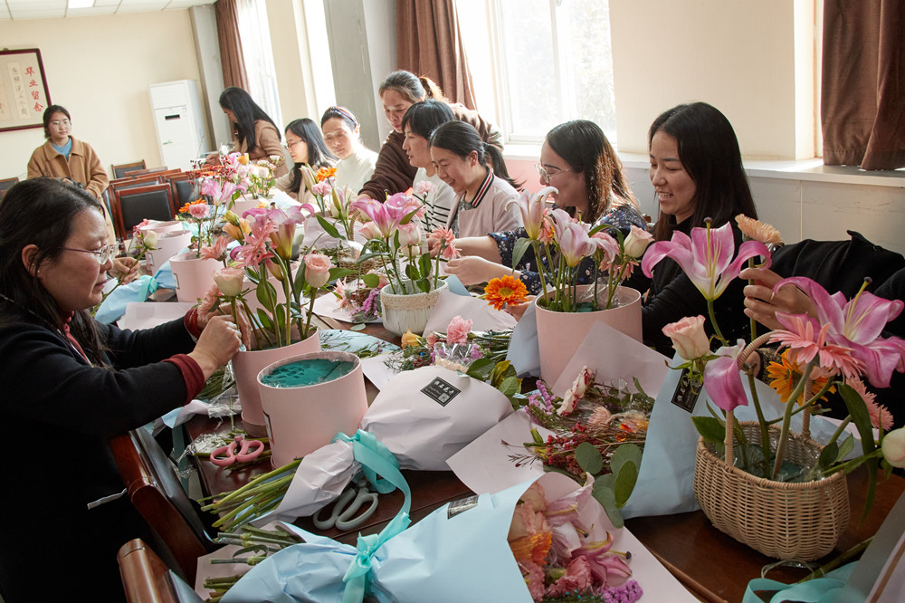 本次主题插花活动共有44名女教职工参加。活动开始前,邱永宽进行简短的发言,他赞扬了本次插花活动的意义,并为女教职工们送上节日祝福。活动邀请了专业的花艺老师现场指导,花艺师向女教职工们讲解了花材、色彩搭配等方面的知识,详细介绍了插花的艺术造型要素和技巧手法,并在现场做了生动的演示。接着女教职工们在插花老师的指导下,挑选花朵、修剪枝叶、整合造型,用灵巧的双手诠释了对花朵和美的理解。各色各样的花经过了她们的修剪整合,变成了一件件赏心悦目的艺术品。最后女教职工们和自己的插花作品进行合影留念。