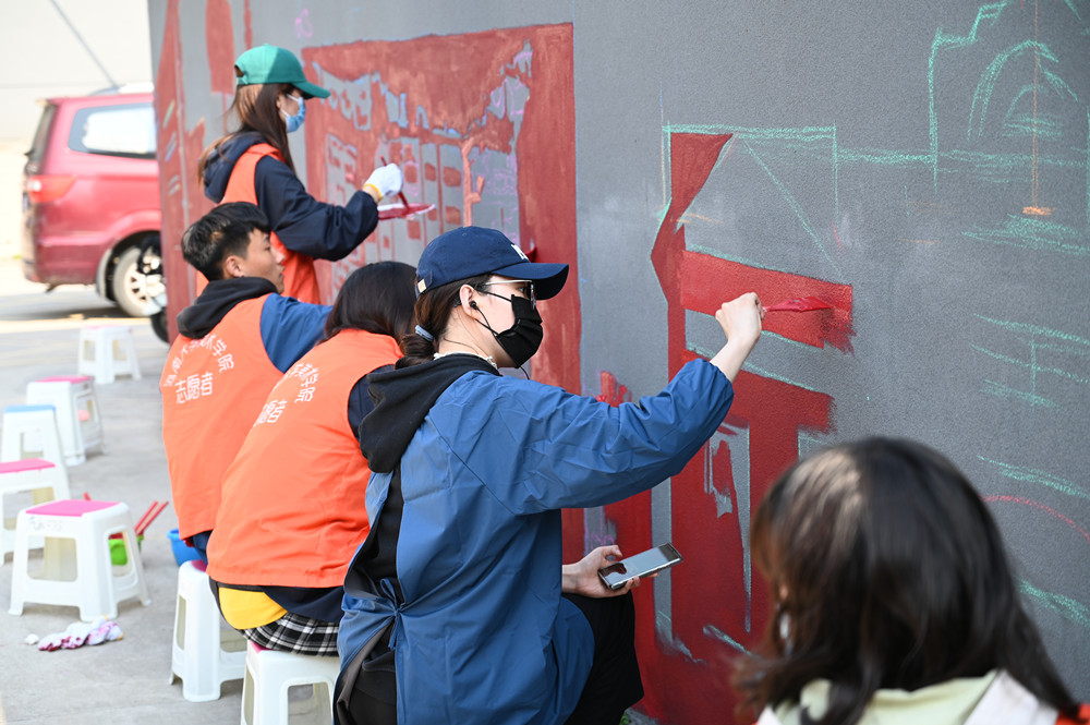 校庆有我,共绘春景。近日,美术学院“七彩绘”文化艺术志愿服务团组织志愿者在明伦校区开展校庆主题墙绘活动。