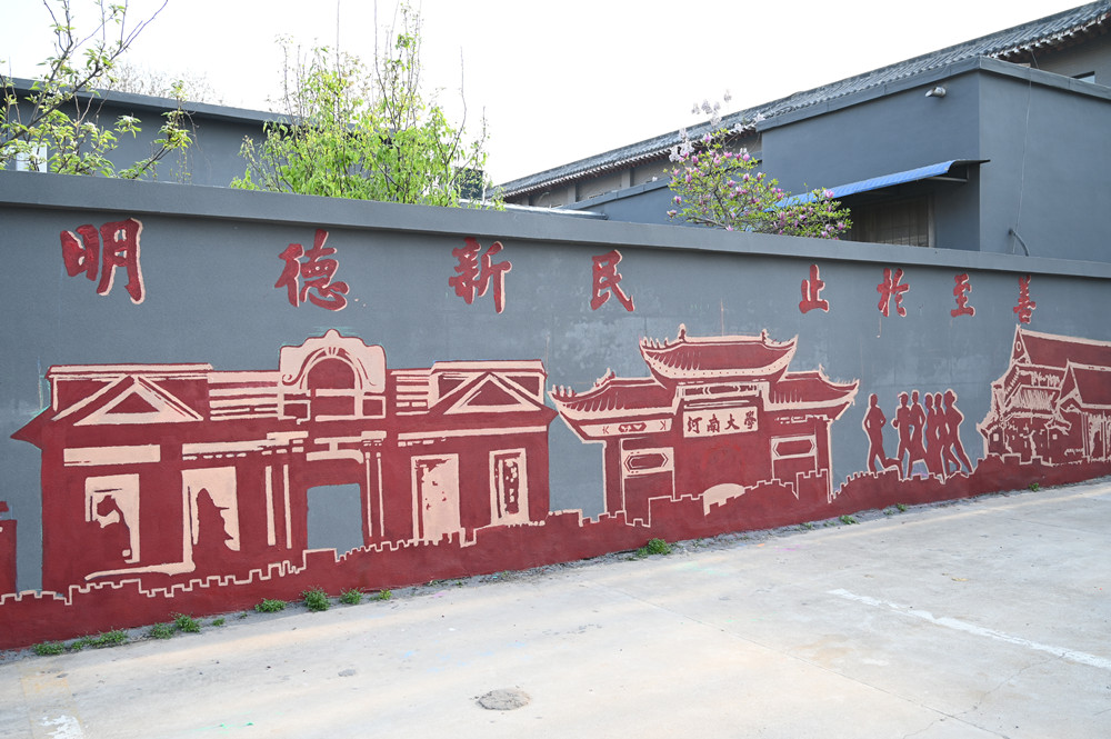 同学们拿起手中的画笔,发挥专业特长,以青春之姿描绘母校峥嵘岁月。校庆主题墙绘的画面布局,以校内标志性建筑场景的转换来展现河南大学的发展历程,构思深入,安排巧妙。驻足于校庆主题墙绘作品前,千年铁塔成为“铁塔牌”学子的精神化身,透露着玲珑巧思与传统奇技;河南留学欧美预备学校校门处,凝聚着放眼世界、开放学习的目光;大礼堂端庄沉稳,中西合璧,于静默中将河大园深情守望。画面正中,是河南大学的南大门,这道古朴庄重的大门,能够唤起万千学子心中深深的眷恋,“明德新民,止于至善”的校训更是铭记于每一名河大人的心间。画面设计深入发掘了河大的百年历史,充分展示了河大精神,景物的变动打破了平行僵硬的框架,以空间的转换对应时代的变迁,将建筑的稳健与时间的流动相结合,这份时间的流转,象征着河南大学110年的风雨历程。这是学校不断前行的110年,从建校之初到如今三个校区协同发展、“双航母”战略全速推进,呈现出勇毅前行的昂扬姿态,亦是河大学子与母校彼此守望、桃李情深的110年。