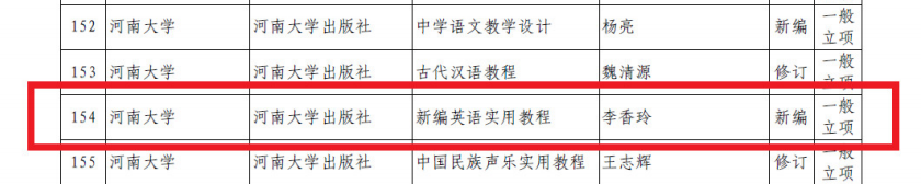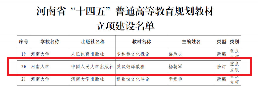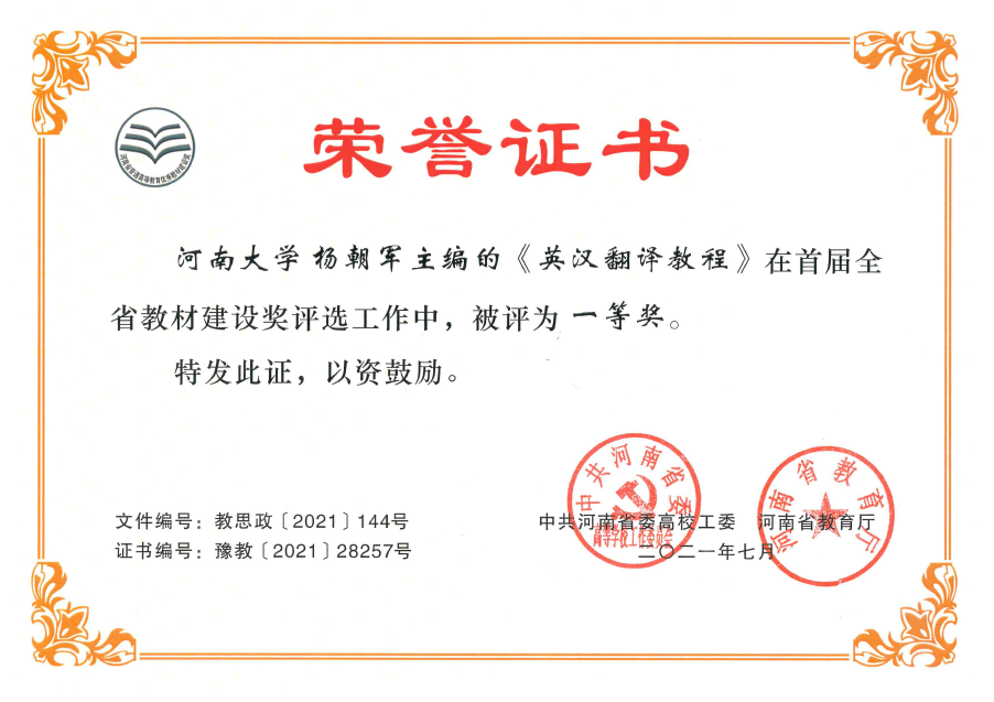 教材建设奖是检阅、展示教材建设服务党和国家人才培养成果,增强教材工作者荣誉感、责任感,推动构建中国特色、世界水平教材体系的一项重大制度。近期,外语学院本科教材建设成果喜获佳绩:获批河南省“十四五”普通高等教育规划教材2部、获首届河南省教材建设一等奖1项、获首届全国教材建设先进个人奖1项、获美国现代语言协会(MLA)年度独立学者奖1项。