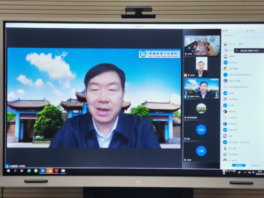 杨朝军首先向学员们介绍了河南大学的悠久历史、外语学院的发展历程和学科发展状况。外语学院拥有外国语言文学博士后科研流动站,外国语言文学一级学科博士学位授权点,外国语言文学一级学科硕士学位授权点,翻译硕士、教育硕士专业学位授权点。外国语言文学为河南省一级重点学科(其中英语语言文学学科为河南省第一层次重点建设学科),英语专业为国家级特色专业、国家级专业综合改革试点。目前,英语专业和翻译专业获批国家级一流本科专业建设点,俄语专业和日语专业获批省级一流本科专业建设点;在河南省普通高等学校第二批本科专业评估中,学院英语专业全省排名第一、日语专业全省排名第二。多年来,外语学院一直重视社会服务,培训团队实力雄厚、经验丰富。杨朝军表示,外语学院会优化课程、精选师资,竭诚为学员做好各种服务,也希望各位学员能够珍惜这次培训机会,认真听讲,积极互动,高标准完成各项任务,收获满满。