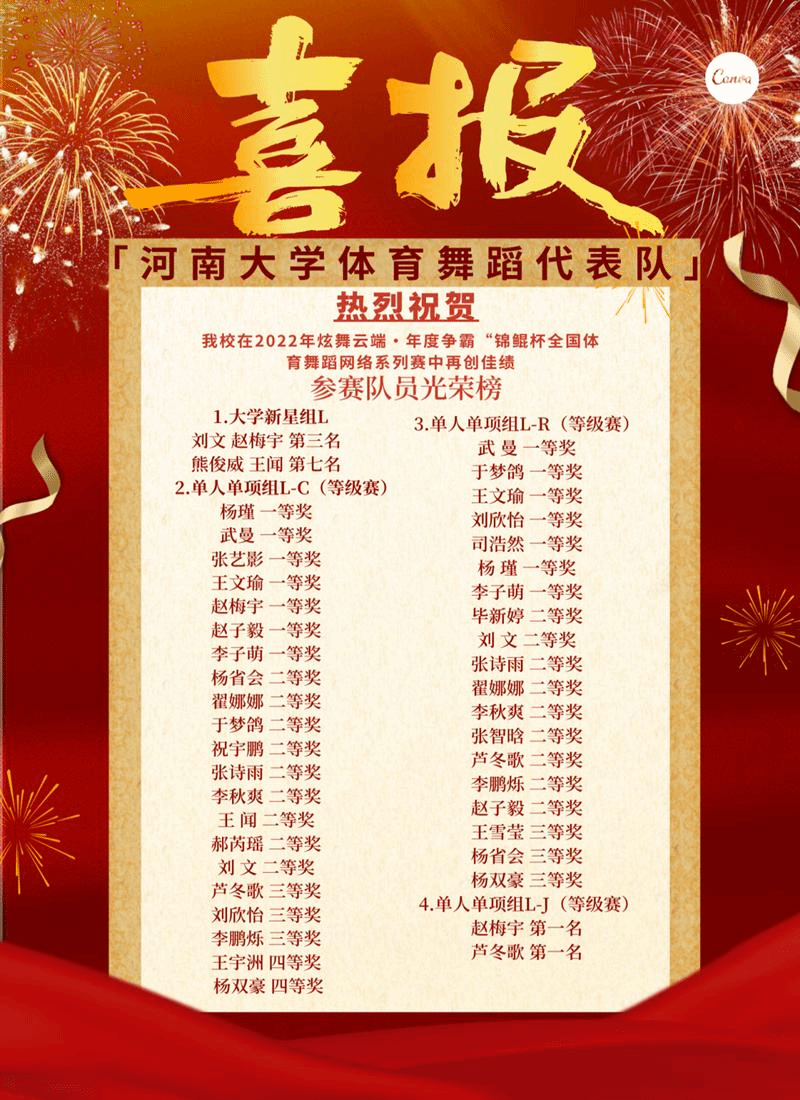 体育学院体育舞蹈专业学生代表河南大学,在指导教师栗丽和张笑笑的精心指导下,经过激烈的多轮次比赛,在与天津体育学院、武汉体育学院、南京体育学院、广州体育学院等各大高校学子的较量中,最终荣获单人单项组16个一等奖,18个二等奖,6个三等奖;在大学新星组比赛中获得1个第三名,1个第七名。