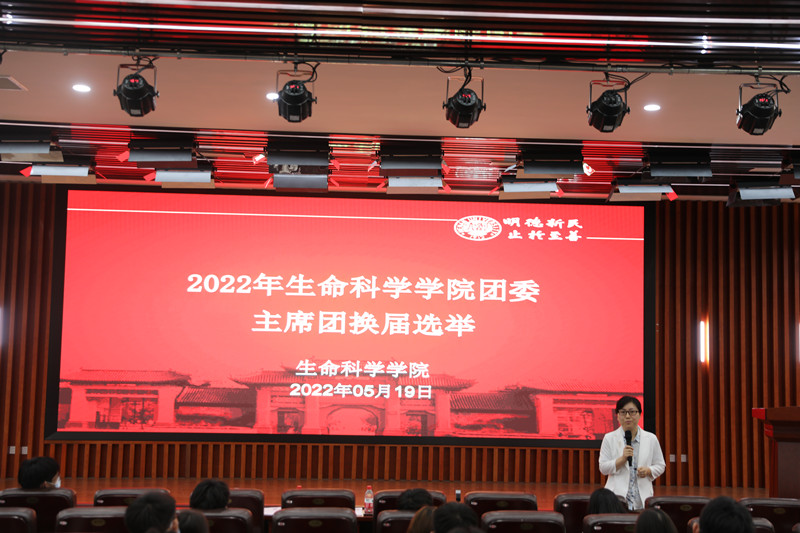 为加强生命科学学院团委能力作风建设,推进学生工作高效、持续开展,5月19日,生命科学学院在学院报告厅举办“生命科学学院团委主席层换届选举暨优秀学生表彰会”。生命科学学院党委副书记程亚敏,团委负责人张丽,团委学生会、青年志愿者协会全体成员及各班级代表参加此次大会。本次大会采取线上与线下相结合的方式进行,由2021届团委学生会副主席张思卉主持。