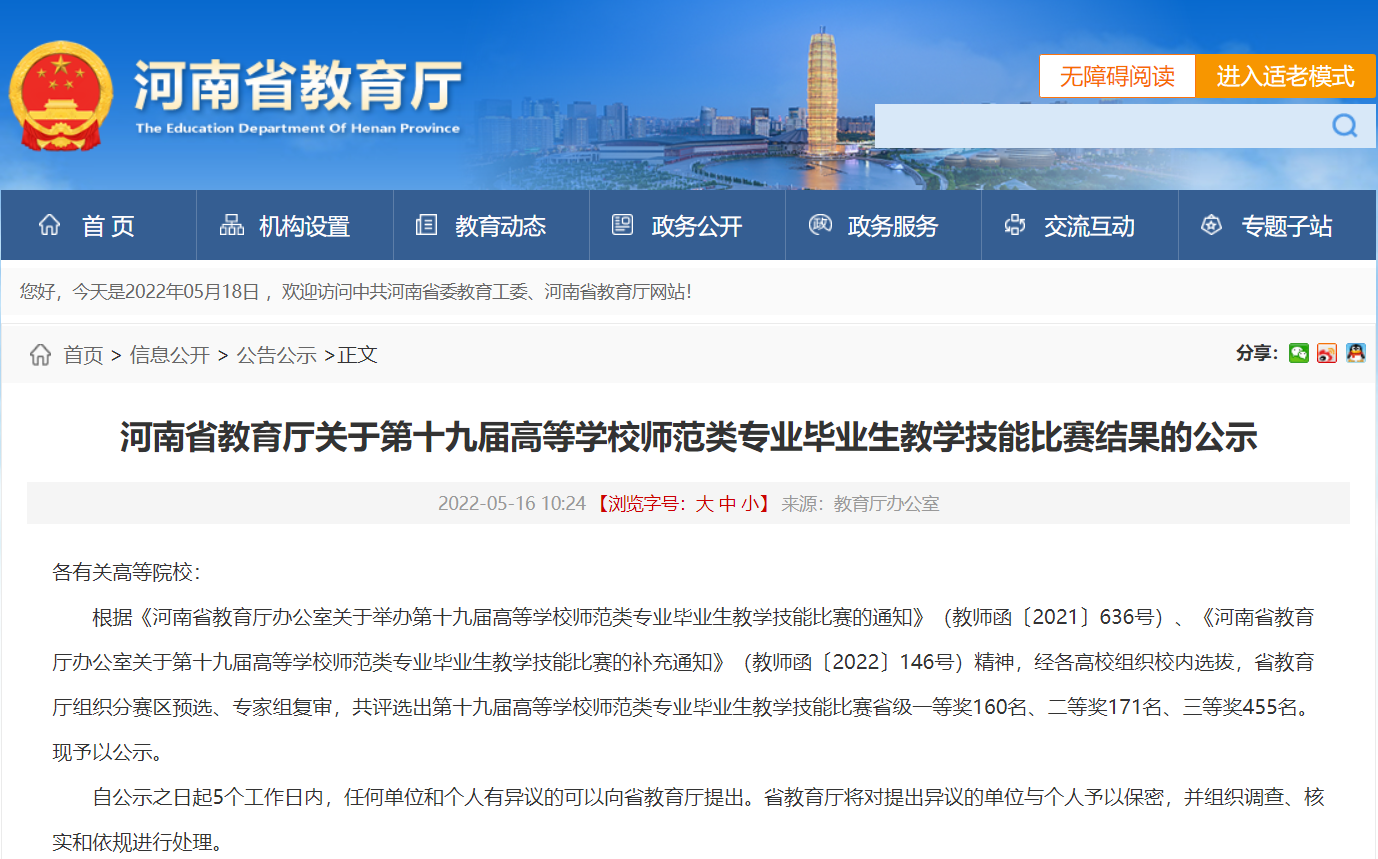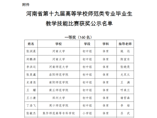 近日,河南省教育厅公布了第十九届高校师范毕业生教学技能大赛成绩,我校体育学院体育教育专业张润晨、郑鹏涛两位同学在比赛中表现突出,得到评委的一致认可,双双获得一等奖,这也是体育学院学子连续第十四年蝉联该赛事一等奖。