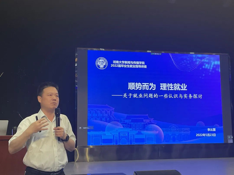为促进新闻与传播学院2022届毕业生高质量就业,5月23日晚,学院于科技馆二楼举办“顺势而为,理性就业”就业指导专题讲座。此次讲座特邀学校就业创业指导中心主任李从国主讲,新闻与传播学院副院长王鹏飞、党委办公室主任陈琳、研究生辅导员孙韵参加了讲座,2022届毕业生300余人通过线上与线下相结合的方式参与了讲座。讲座由王鹏飞主持。