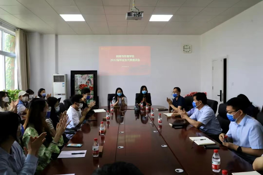 5月27日上午,新闻与传播学院在二楼会议室举办2022届毕业生代表座谈会,学院全体领导班子成员,各系主任与支部书记,研究生、本科生代表出席会议。会议由院党委副书记郝魁锋主持。