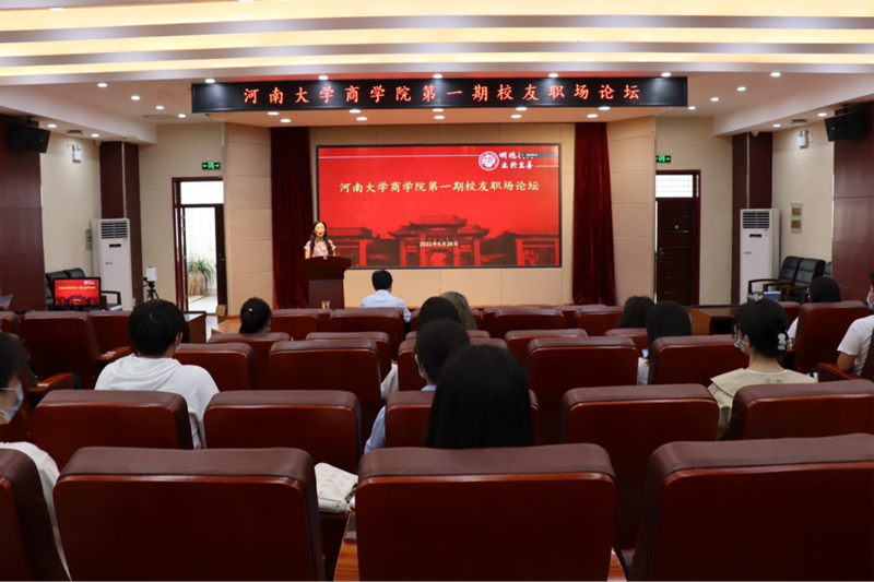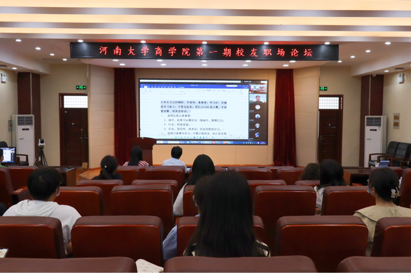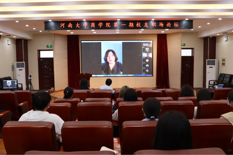 喜迎河南大学110年校庆之际,为加强同校友的联系,提高商学院学子对未来创业、就业的认识与理解,营造在校学生与优秀校友和谐交流的良好氛围,商学院于5月28日下午在二阶报告厅举办商学院第一期校友职场论坛。2003级人力资源管理专业毕业生武凤兰及2004级市场营销专业毕业生轩雷受邀参与本次论坛。本次论坛采用线上线下相结合的方式,由商学院党委副书记李平主持,部分师生参加。