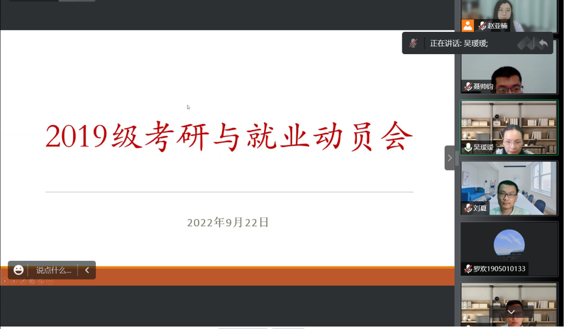 最后,赵亚楠老师在会议总结中对当前2023届本科毕业生的考研及就业工作进行了再动员,鼓励同学们积极行动,做好自己的“孤勇者”。无论是选择考研抑或就业,一定要尽早为自己做打算,在努力的过程中,和老师保持良好的沟通,学院老师们愿意随时为同学们提供帮助。