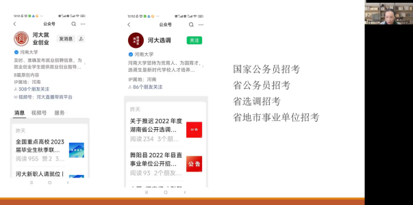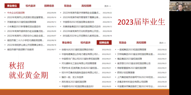 随后,吴瑷瑷结合学院2018级本科生考研情况及全国大学生考研情况的相关数据进行了对比分析,建议同学们从“理性看待考研”“合理确定目标”“全力以赴备考”三方面着手,提高一战成功率。“考研的终极目标还是为了工作,同学们应结合自身发展目标,理性确定努力能够实现的目标,争取一次上岸。既然确定了目标与方向,就风雨兼程,全力以赴。”最后,吴瑷瑷建议同学们抓住“秋招”这个就业黄金期,备考的同时积极关注“河南大学就业创业信息网”“河大就业创业”“河大选调”等平台发布的求职就业信息,给自己预留一个备选方案。