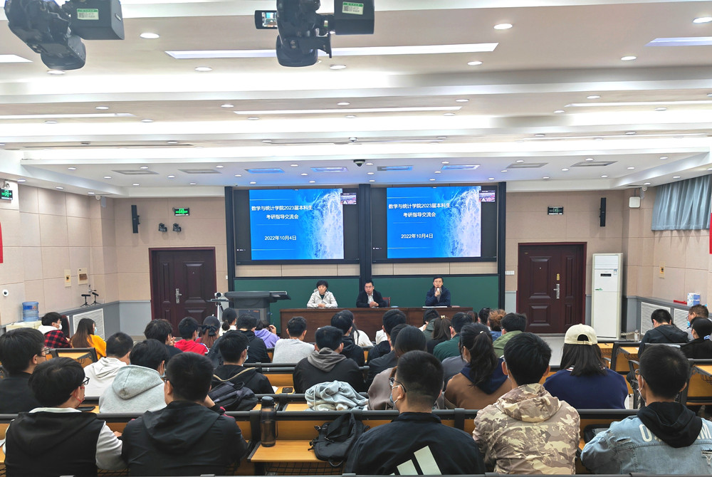 在2023年硕士研究生招生考试报名之际,为帮助考研学子明确报考目标,科学填报志愿,10月4日上午,数学与统计学院在南阶教室举办了考研指导交流会。学院党委副书记赵红磊,副院长王波、解俊山,各专业指导教师和辅导员,2023届考研学子参加了会议。会议由赵红磊主持,采用线上线下相结合的方式进行。
