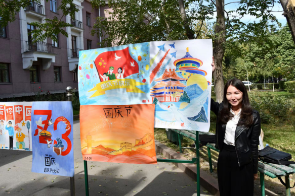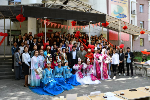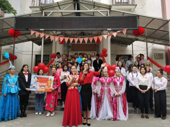 9月29日中午,吉尔吉斯斯坦首都,丝绸之路学院和民族大学吉中学院师生在丝绸之路学院、吉中学院所在教学楼前举行系列活动,共同庆祝第73个中华人民共和国国庆节。河南大学丝绸之路学院执行院长梁建忠、副院长拉希德教授,民族大学吉中学院苏菲娅院长及两个学院的部分师生参加了活动。