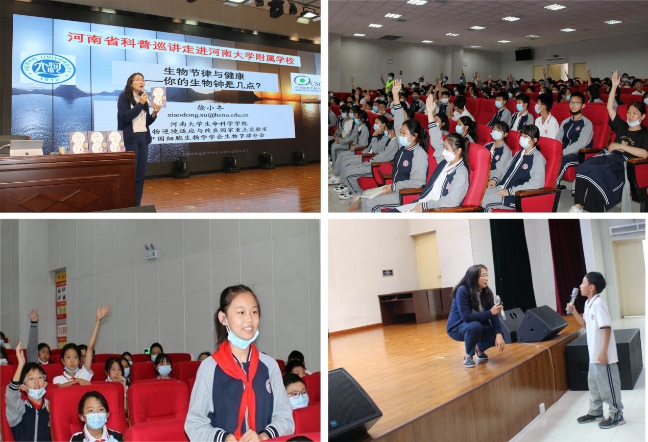 金秋送爽、丹桂飘香。为响应中国科协、中国细胞生物学学会等18部门“喜迎二十大,科普向未来”的号召,在全社会营造爱党爱国、热爱科学、崇尚创新的良好氛围,激发青少年的创新创造潜能,生命科学学院师生于9月23日赴郑东新区河南大学附属学校为中小学生开展“生物节律与健康”主题科普活动。河南大学杰出人才特区支持计划特聘教授、中国细胞生物学学会生物节律分会副会长徐小冬教授带队,青年教师王来副教授、袁力博士、高凯博士,研究生代表陈梦真、陈天恩、岳淑敏参加了活动。