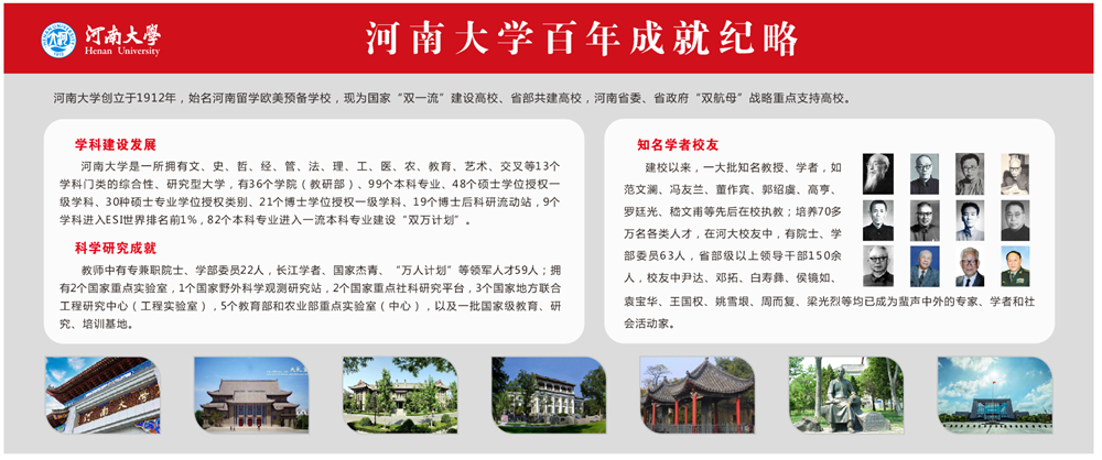 为了营造浓厚热情的校庆氛围,从110年校史中汲取奋进力量,传续河大精神薪火,学院以“见证悠久的发展历史、彰显一流的办学成就、传承深厚的文化底蕴、展现辉煌的远景蓝图”为主题,将一楼走廊布置为河大校史文化走廊。走廊的入口处张贴大幅的河南大学110周年校庆系列海报,分别是校庆主海报、“明德新民,止于至善”校训海报,和“团结、勤奋、严谨、朴实”校风海报,营造出隆重喜庆的氛围。走廊第二部分展板是河大校史沿革图,以简明扼要的方式展现学校110年来筚路蓝缕、风雨兼程,却始终弦歌不辍、自强不息,在与党的需要、民族复兴、国家发展的同频共振中一次次铸就辉煌的奋斗史。第三部分展板记载了河大建校以来的学科发展、科研成就和学者泰斗及著名校友,展现学校110年一流的办学成就和名师荟萃、钟灵毓秀之风采。第四部分展板使用蓝色背景和大幅标语恭祝河大110周年生日快乐、再铸辉煌。