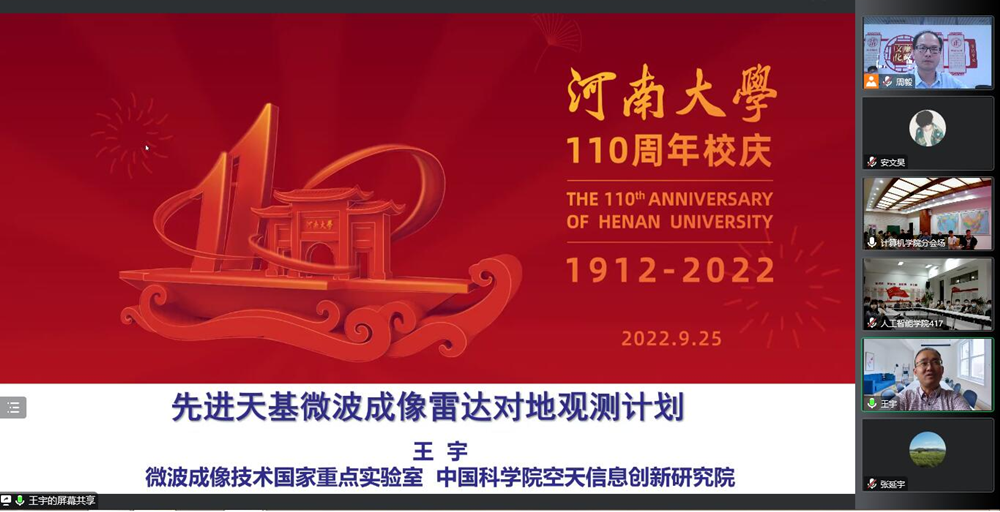 王宇首先表达了对母校110岁生日的祝福,回顾了大学期间的美好时光和奋斗历程,深情感恩母校对自己的教导与栽培,预祝母校在新的百年征程中重塑辉煌,建设成为世界一流大学。随后,王宇以“中国人造卫星之父”赵九章(两弹一星功勋奖章获得者、河南大学校友)的事迹为背景开启了自己的科学研究成果报告,介绍了航天对地观测See-Earth计划的系统构想、关键技术、性能分析以及应用潜力,对主持LT-1卫星先进天基微波成像雷达研发的艰辛历程和显著成效进行了总结,对下一步更为全面的地球动态监测计划进行了展示,并对未来月球探测、金星探测、谷神星探测等世界前沿课题进行了展望。报告结束之后,线上线下的师生们踊跃交流,王宇答疑解惑,现场氛围热烈,既充满了浓厚的学术气息,又展现了浓郁的校友情深。全体师生对王宇的报告感慨万千,对航天科技的发展由衷敬佩,对祖国的日益强大感到自豪。