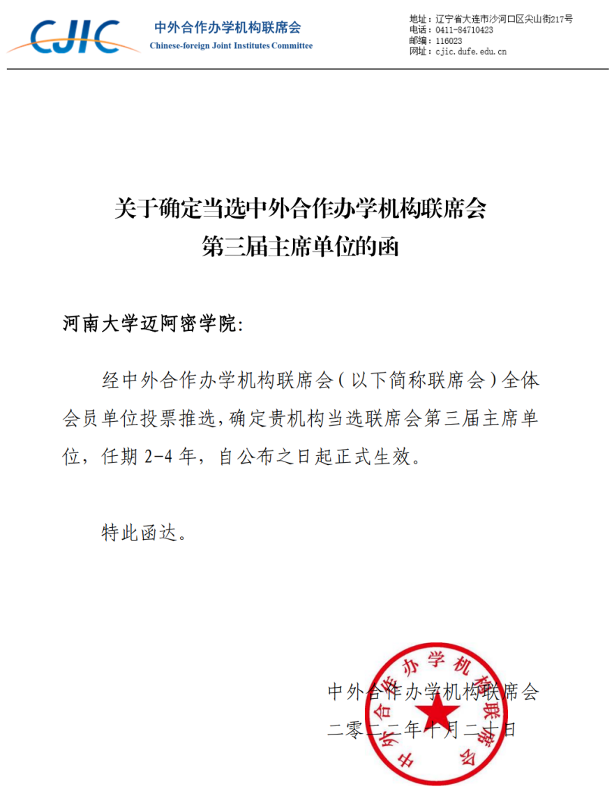 近日,中外合作办学机构联席会(简称联席会)来函,正式确定河南大学迈阿密学院当选联席会第三届主席单位。