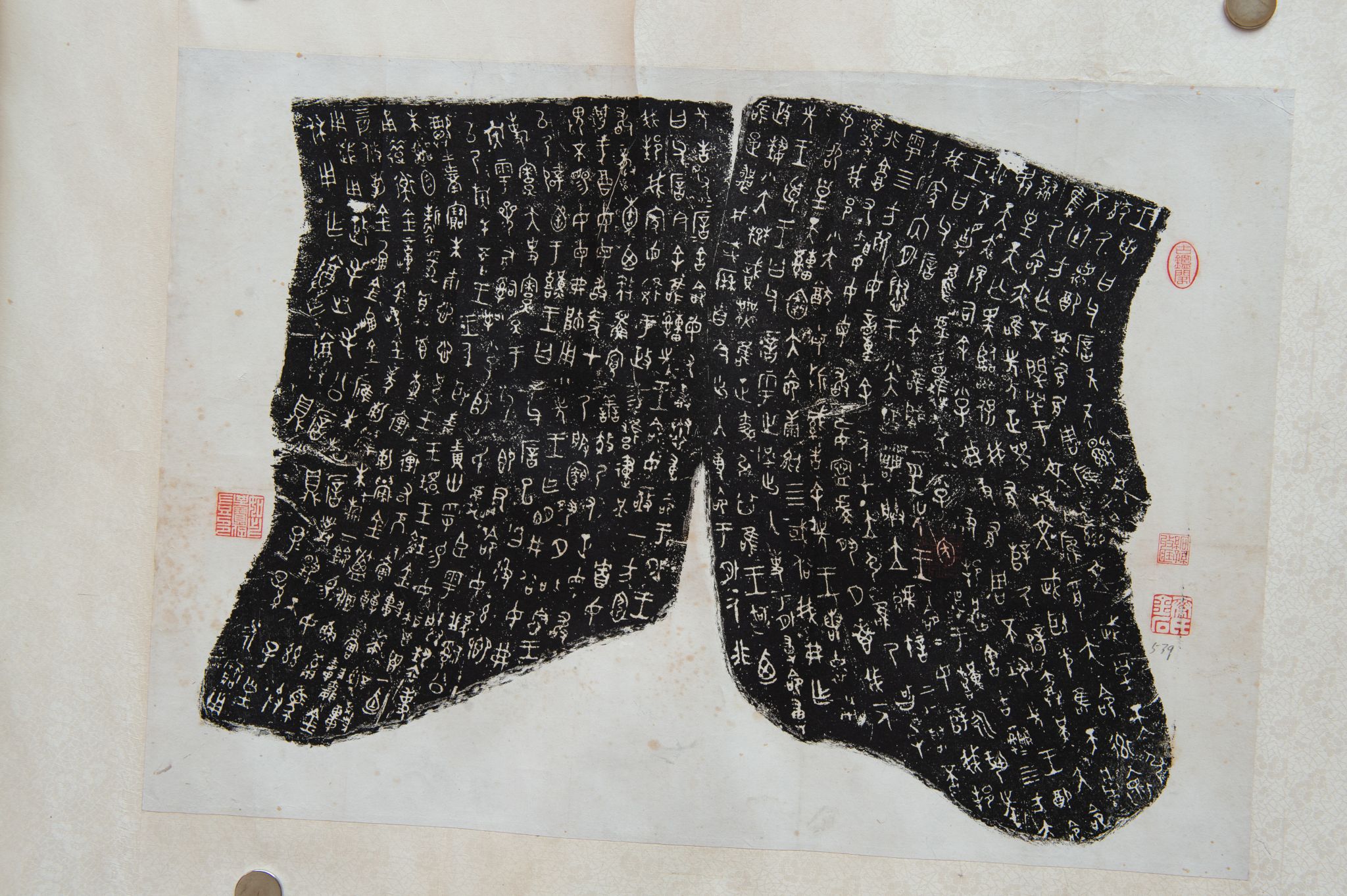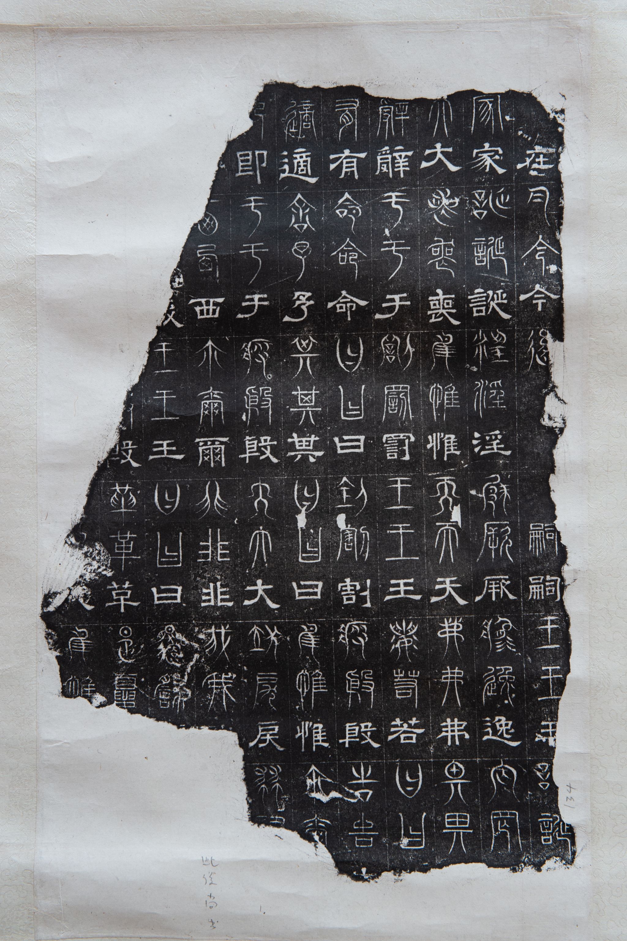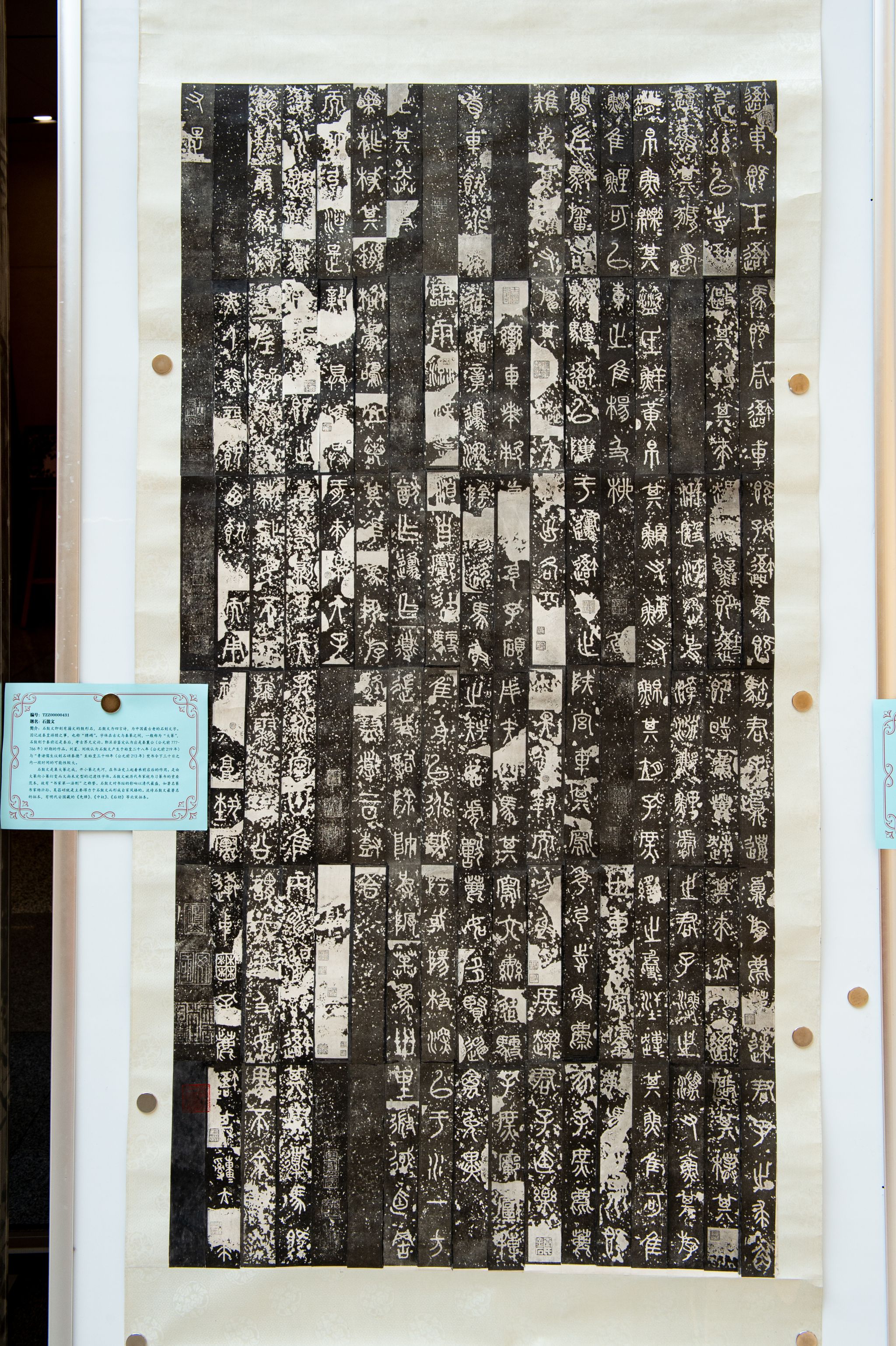 本次展出的馆藏《纪泰山铭》拓片原碑为唐玄宗李隆基泰山封禅时亲笔所题,其书法既继承汉隶古风,又兼具时代特征,是书法研究不可多得的材料。西周晚期金文的典范之作《毛公鼎》拓片展示了当时流行的大篆字体;《石鼓文》拓片为介于古文与秦篆之间的籀文,是由大篆向小篆衍变的过渡性字体,在书法史上起着承前启后的作用;《三体石经》拓片见证了古文、篆、隶三种字体的历史嬗变,对古文字学研究同样具有重要的学术价值;唐代《九成宫醴泉铭》则是书法练习者的必备模本。此外,还展出部分精美石刻绘画拓片等。