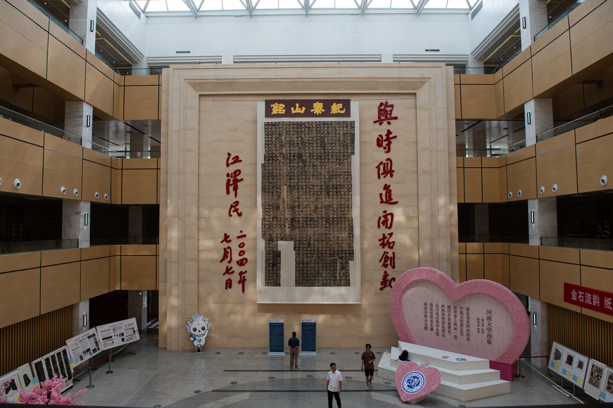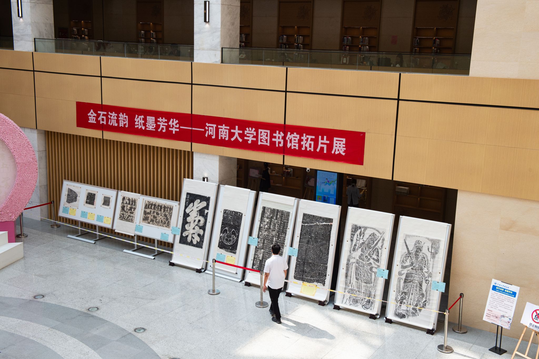 在2025届毕业生行将离开母校之际,图书馆在金明馆大厅举办了以《纪泰山铭》大型拓片为主展品的“金石流韵 纸墨芳华——河南大学图书馆古代碑刻拓片艺术展”。
