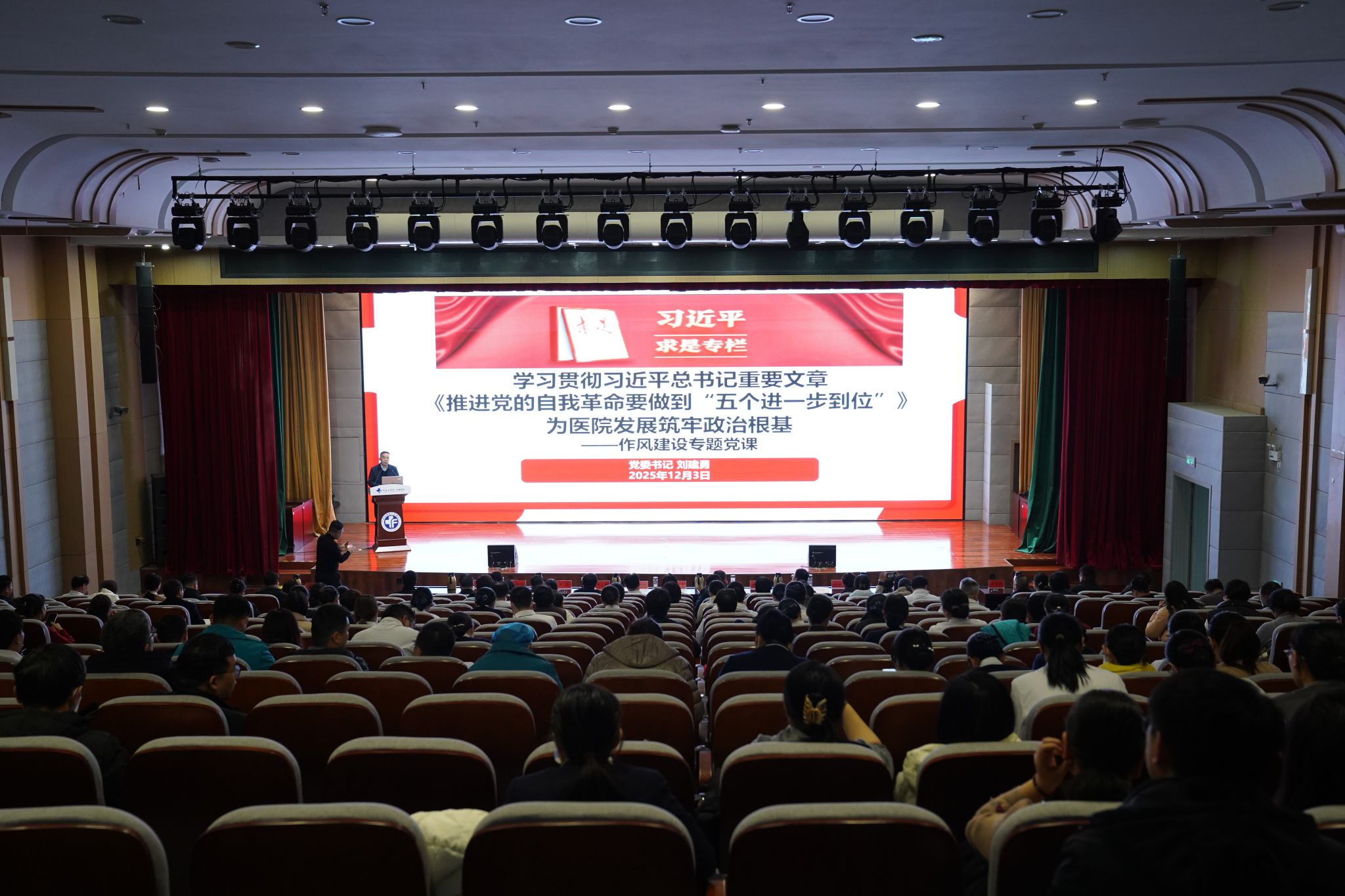 本次党课聚焦学习贯彻习近平总书记重要文章《推进党的自我革命要做到“五个进一步到位”》,紧密结合学校贯彻落实党的二十届四中全会精神工作部署,深入查摆医院在作风与思想建设中的突出问题,进一步动员全院上下凝心聚力、正风肃纪,确保医院工作始终沿着正确的政治方向前进。