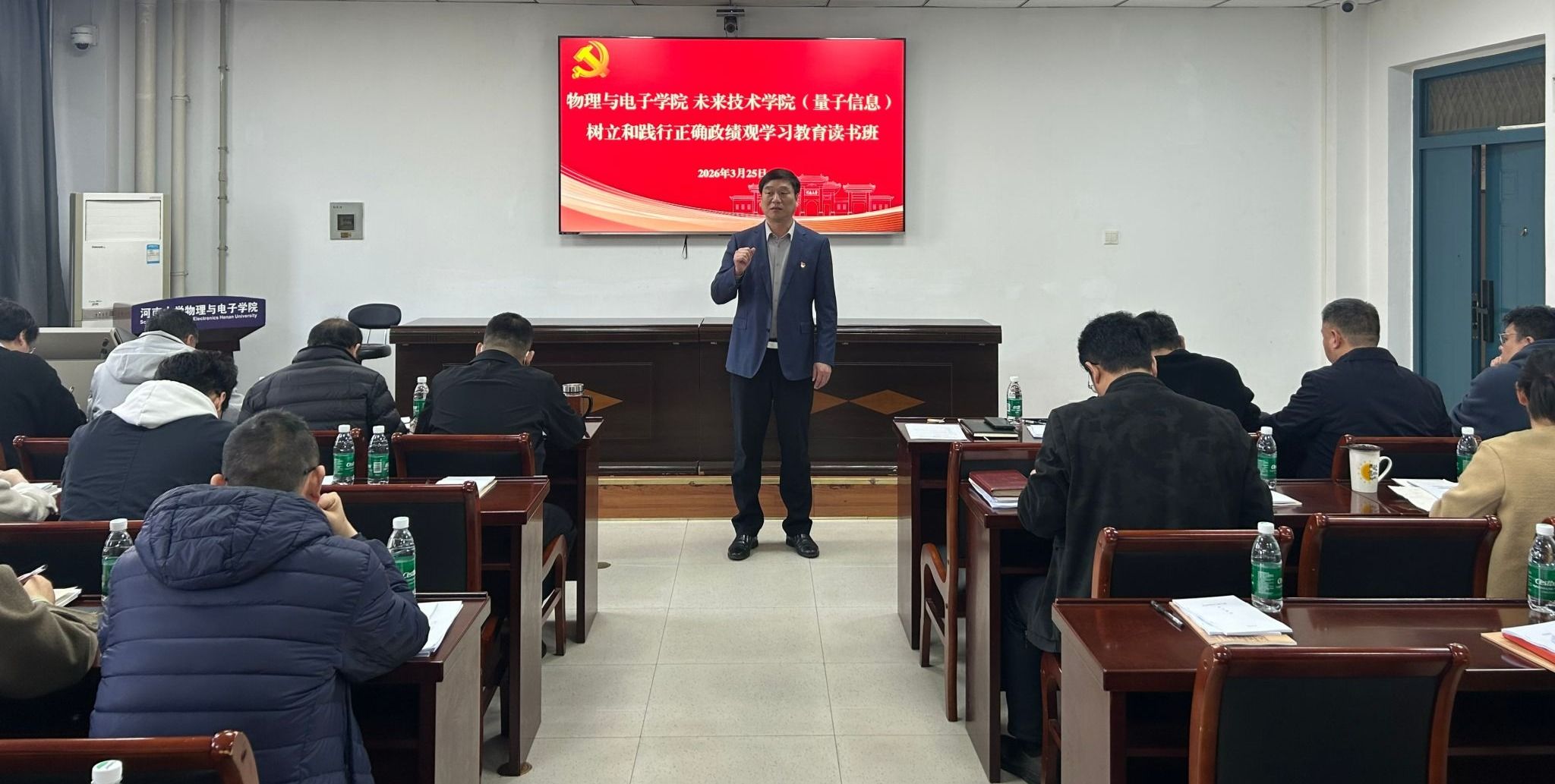 按照开展树立和践行正确政绩观学习教育工作安排,3月25日至26日,物理与电子学院、未来技术学院(量子信息)采取领读领学、专题党课、集中自学和交流研讨等相结合的方式,联合举办树立和践行正确政绩观学习教育读书班。学院党委委员、班子成员、组织员、党支部书记、系室主任及党员代表参加。学院党委书记张慧主持并作专题党课辅导。