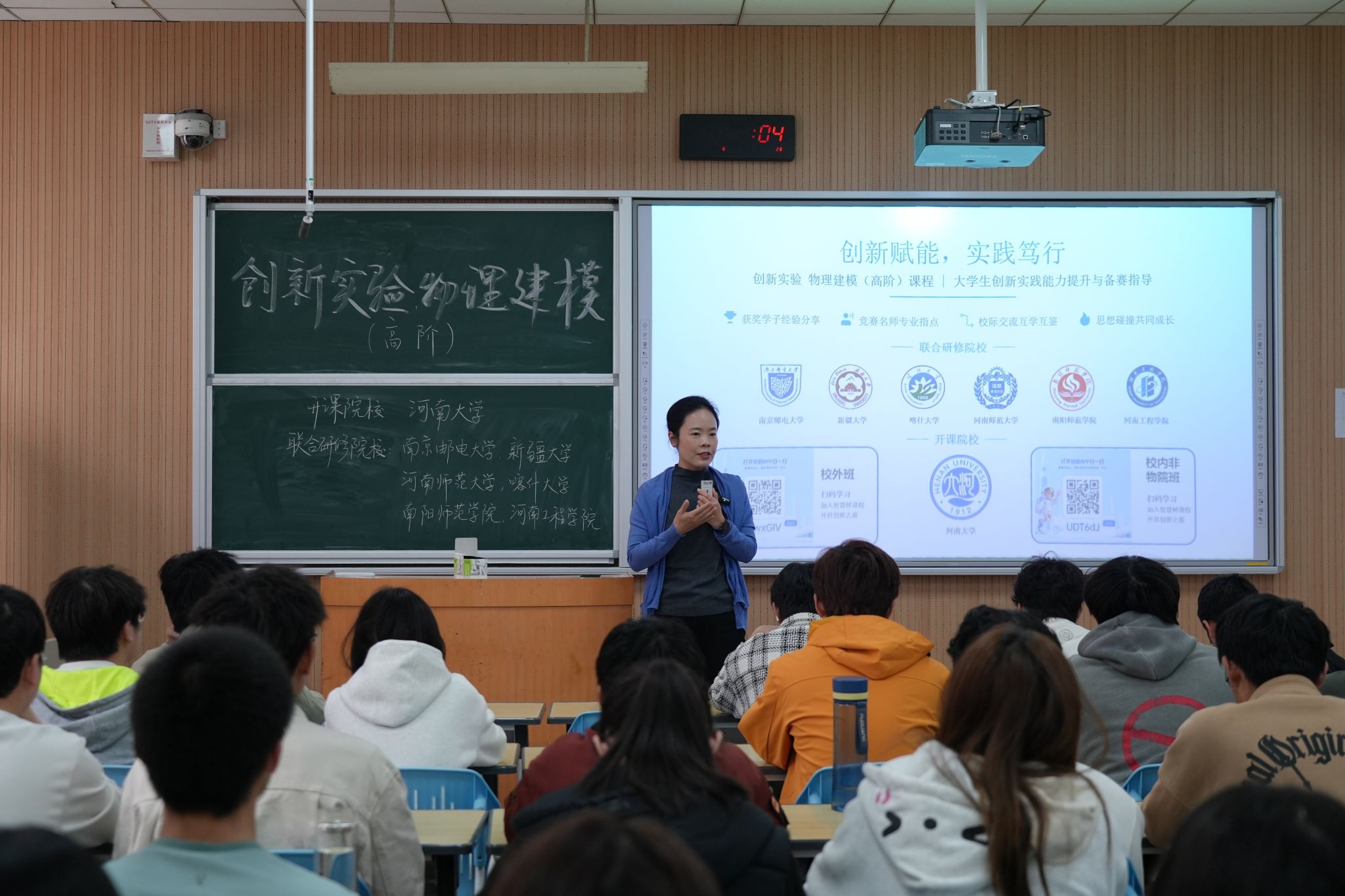 为深化教学改革、强化竞赛育人的针对性和持续性,搭建东、中、西部高校间的学术交流桥梁,3月26日,以“创新赋能,实践笃行”为主题的河南大学《创新实验物理建模(高阶)》首场跨校直播课在金明校区综合楼5104教室开讲。讲座以线下授课+线上直播的形式进行,河南大学物理与电子国家级实验教学示范中心副主任魏凌教授主持讲座。