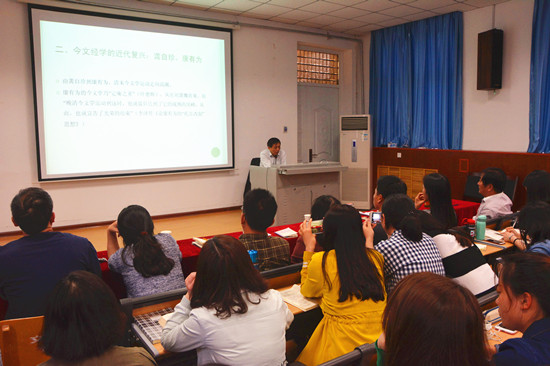 随后,校党委书记、博士生导师关爱和教授以“中国近代今文经学与进化论的传播对文学转型的影响”为题作了学术报告。关爱和教授以经学为切入点,深入浅出地介绍了学术史的公案:今古文经学之争。他指出,近代士大夫阶层努力寻求有利于国计民生的学术路径,今文经学复兴,由龚自珍到康有为,清末今学运动走向高潮。严复、梁启超、胡适在进化论传播和文学转型方面做出了巨大的贡献。以梁启超的旗手的文学界革命的不断推进与深化,给世纪之交的文坛带来了前所未有的喧嚣与骚动。报告在同学们热烈的掌声中结束。
