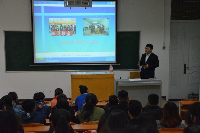 3月11日下午,文学院2014届优秀毕业生、河南寻美视觉文化传播有限公司董事长周光普应邀回校,在文学院一楼大教室为学弟学妹们带来了以“从影视社团到创业团队”为主题的讲座。