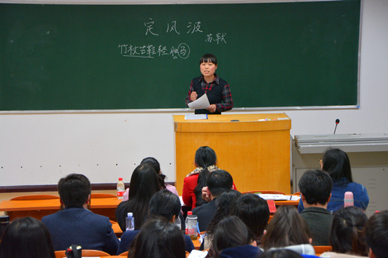 经过激烈的角逐,共有八名选手一路过关斩将、脱颖而出,来到决赛的现场。选手们在决赛的赛场上尽其所能,各展才华。其中,1号选手蔡睿以条理清晰的语言,富有感染力和表现力的语气,讲解了《一块特别的石头》,2号选手刘心媛同学以细微的角度切入《老王》,解读了杨绛先生文中 “那是一个幸运的人对一个不幸者的愧怍”背后的温情;7号选手许艳杰细致入微地讲解了苏轼《定风波•三月七日》一词。她从炼字的角度分析了词中的“任”字的豁达,“情”字的双关,讲解鞭辟入里,板书清新秀丽,博得了在场师生的热烈掌声。