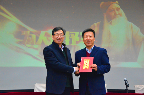 在赠书环节中,陈涌泉分别向我校图书馆、文学院和艺术学院捐赠了自己的著作《程婴救孤》。张宝明为陈涌泉颁发了“河南大学兼职教授”的聘书。