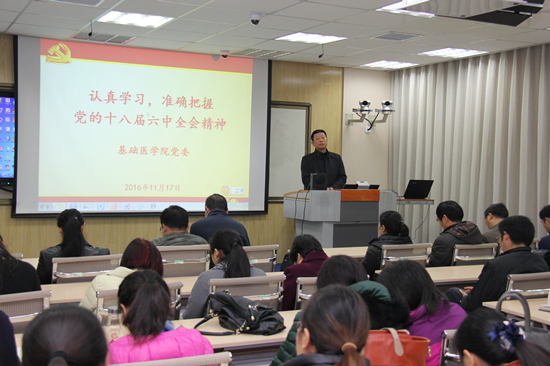 11月17日下午,基础医学院在学院六楼录播室召开学习十八届六中全会精神会议。会议由院党委书记郭甲社主持,学院全体中层以上干部和全体师生党员参加会议。