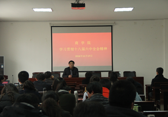 11月17日下午,商学院在院一楼报告厅召开了深入学习贯彻十八届六中全会精神会议。学院全体教工党员参加了会议,会议由商学院党委书记杨俊中主持。