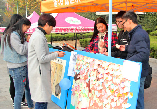 本次情诗大赛共分为“逆风未解意,叵耐相思苦”、“君有言,卿有歌”、“总有爱,不知如何表达”、“遇见未来的自己”、“为你读诗”、“三行诗与图的故事”等六个板块。清新淡雅的中国风展板、汇聚思念之情的告白墙吸引了众多师生驻足参与。羽帆诗社精心准备了明信片和书签等礼品,热情地为大家介绍活动的详细内容。同学们纷纷拿起纸笔,写下表白的话语。现场的表白墙上写满了许多动情温暖的留言。此外,羽帆诗社还积极使用微博、微信等进行宣传,借助新媒体提高同学们的参与度,增进对诗歌的了解。