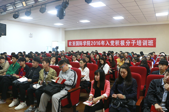 10月13日——16日,欧亚国际学院分党校举行2016年入党积极分子培训班,155名入党积极分子的参加,培训班采取课堂教学、校园文明创建实践环节、分组讨论及学员课外自学相结合的方式进行。欧亚国际学院党委高度重视本次入党积极分子培训班,邀请并组织学校正处级纪检监察员张秋梅、原马列德育教研部主任马树功教授、欧亚国际学院党委书记谷跃峰以及学院党务负责人、学生支部书记担任此次培训讲师。