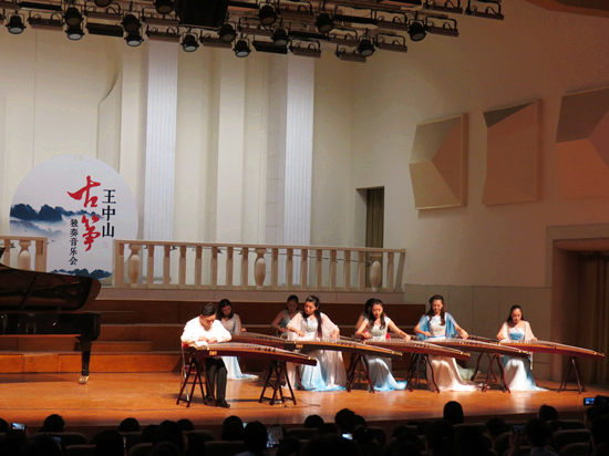 一曲由娄树华传谱而成的《渔舟唱晚》拉开了音乐会的序幕。此曲是一首颇具古典风格的河南古筝乐曲,描绘了夕阳西下、晚霞斑斓,渔歌四起,渔夫满载丰收的喜悦欢乐情景。随后一首纯朴、高昂的“信天游”风格的《山丹丹开花红艳艳》带动现场气氛从辽阔悠扬变得欢快热烈。接着,王中山用精湛的演奏技巧向我们展示了具有山野风情的《彝族舞曲》和深沉廻转的《云裳诉》,两首乐曲以不同风情的曲调分别向我们描绘了彝家山寨迷人的夜色和戏剧性的悲剧爱情故事。王中山精彩的演奏令观众沉浸其中。