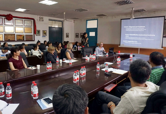 下午3点,学术报告交流活动在护理学院二楼报告厅如期举行。护理学院相关负责人、教师以及研究生与会并聆听报告。Sonya Grypma以Canadian Nursing Education为题,介绍了加拿大护理教育发展的历史及现状,并以西三一大学护理学院为例讲解其教育理念、课程设置以及对未来的展望。随后,Barbara Astle教授针对Canadian Health Care System & Local /Global Health做了相应报告,主要介绍了加拿大卫生保健系统以及护士在其中发挥的重要作用,以及其个人最新的研究进展。Sheryl Reimer-Kirkham教授以Canadian Health Care and Nursing Policy为题介绍加拿大健康服务以及护理服务的相关法规及政策。到会的老师和同学们与三位教授针对加拿大护理研究生教育、加拿大临终关怀及安乐死现状、社区护理与临床护理分工等问题进行深入交流与讨论,会场秩序井然,气氛热烈。